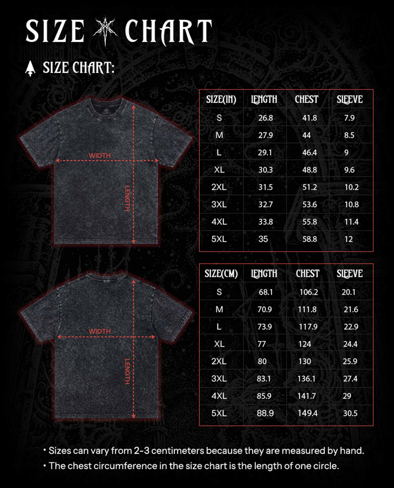 • Size: from S to 5XL (chest width/T-shirt length/sleeve length) (inch)